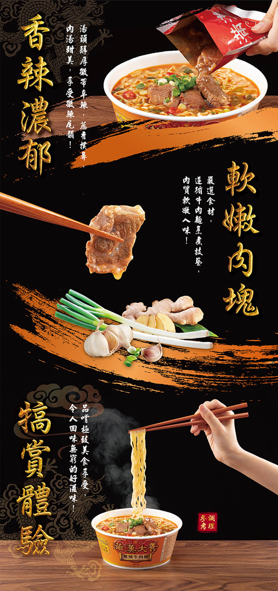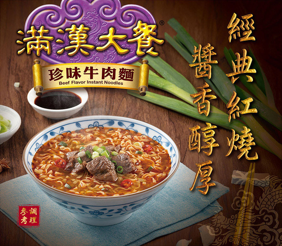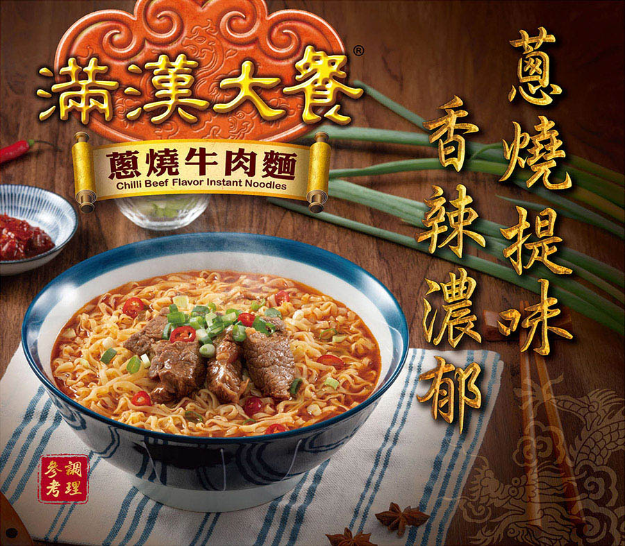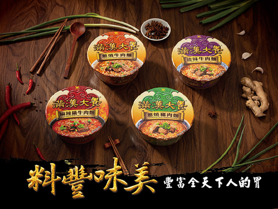 滿漢大餐承襲華人宮廷料理-滿漢全席的精髓,以塑造消費者心中最具代表性的豪華即食麵為願景,持續鑽研當代最佳製麵工藝,融合「軟嫩肉塊、層次湯頭、帶勁麵體」做出上乘麵食,讓沒有時間好好用餐、不願將就的您,願意多付出一點、享受好一點,好好犒賞自己味蕾,滿足方便卻不隨便的口感享受!