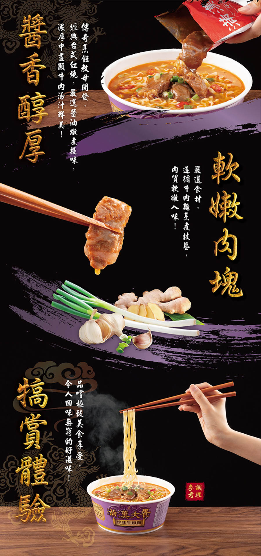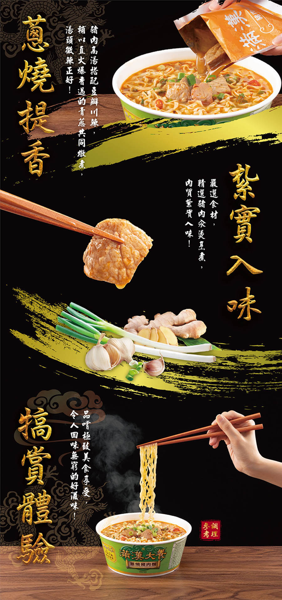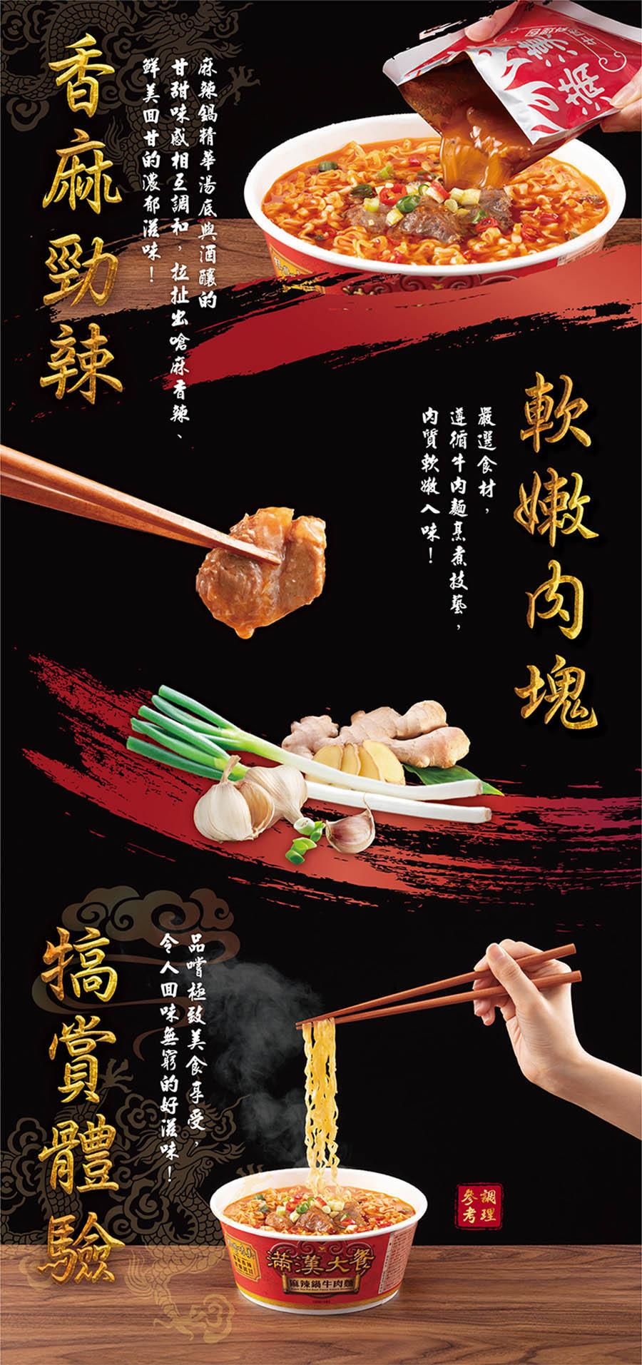 滿漢大餐承襲華人宮廷料理-滿漢全席的精髓,以塑造消費者心中最具代表性的豪華即食麵為願景,持續鑽研當代最佳製麵工藝,融合「軟嫩肉塊、層次湯頭、帶勁麵體」做出上乘麵食,讓沒有時間好好用餐、不願將就的您,願意多付出一點、享受好一點,好好犒賞自己味蕾,滿足方便卻不隨便的口感享受!