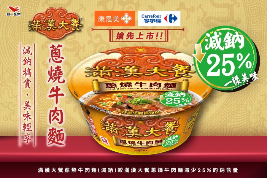 紅到海外的滿漢大餐系列,引領世界飲食趨勢,推出臺灣首款減鈉泡麵!減鈉25%,負擔更少,美味不變!康是美 家樂福搶先上市!