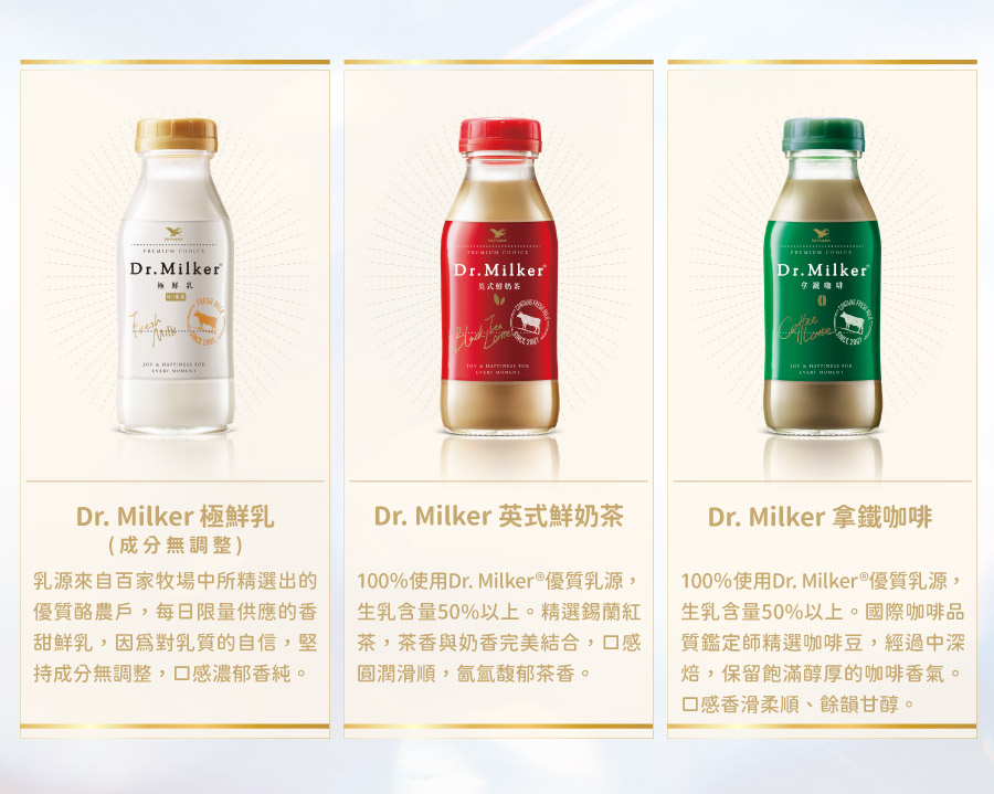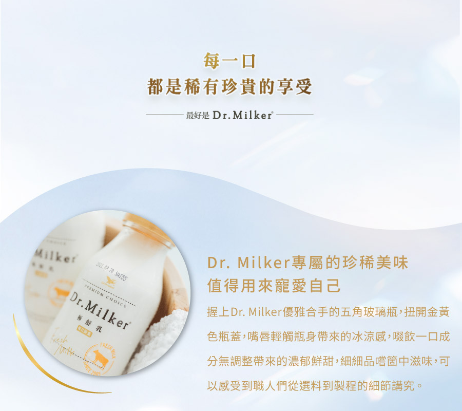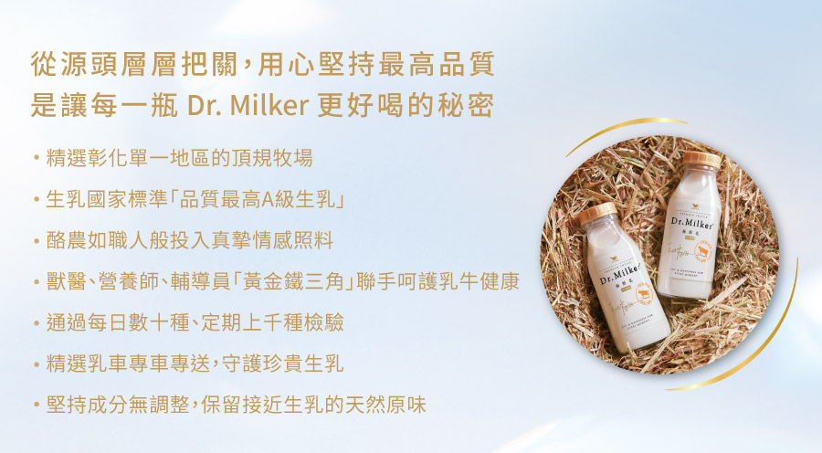 Dr. Milker乳源精選來自彰化地區、各項國家評分標準合計最高的職人牧場,因為對品質的自信,堅持成分無調整。每日限量乳源,製程層層把關,由專車至牧場收取運送,五角合手的透明玻璃瓶,盛滿著酪農的用心與堅持,稀有珍貴的滋味,邀您一同啜飲品味。