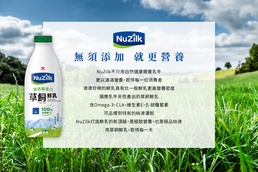 Nu意即New;Zilk既是Milk又是Silk。NuZilk嚴選來自紐西蘭純淨草飼乳源,不僅止於產地,連乳牛的吃喝、活動都嚴格要求,用層層把關的堅持,誕生了如絲般滑順、營養密度較一般鮮乳高「NuZilk」草飼鮮乳,只為款待每一位消費者。