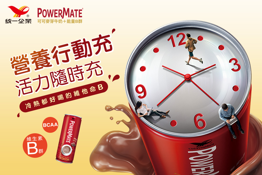 POWERMATE是針對為了生活與工作打拼的上班族而設計的好喝方便營養補充飲品,上班族工作忙碌、飲食作息不正常而沒有時間好好進食、營養有吃沒有到,POWERMATE可可麥芽牛奶以牛奶及可可為基底,加入維生素B群,提供立即性的營養補充,讓上班族可以隨時隨地維持健康、體力和活力,輕鬆面對生活中各種挑戰!